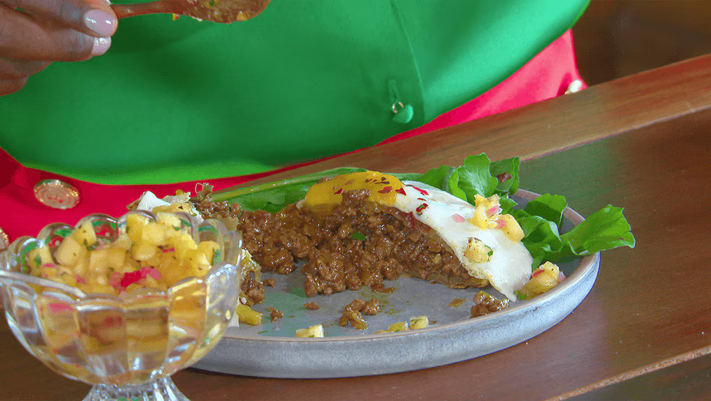 Bobotie is a classic South African spiced mince dish made with egg and bread as well as spices. A bobotie contains apricot jam or chutney & vinegar. The sweet & savoury flavours make bobotie unique.