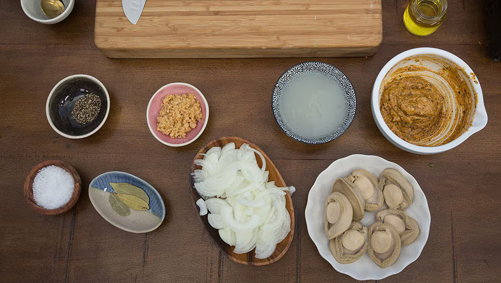 - To prepare the abalone, heat olive oil in a pan, to this add the onions and sauté until translucent, to this add the bay leaves and garlic and continue cooking until the garlic becomes fragrant. Add in the sliced Abalone and cooked for about a minute or two before adding in the curry butter. Allow this mixture to cook for a further 1-2 minutes before removing from the heat.