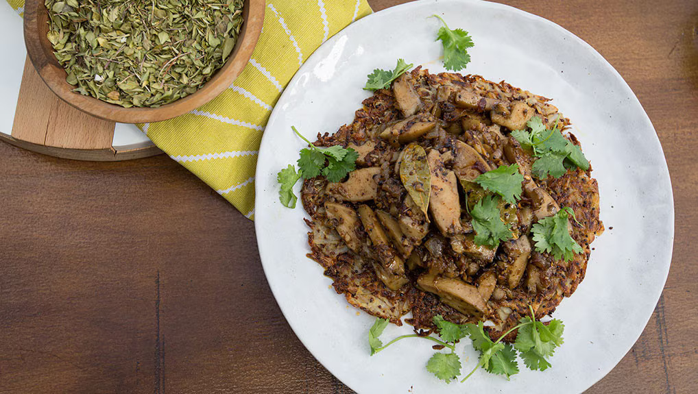 Pan Seared Abalone with Onion, Garlic and a Cape Malay Curry Butter Sauce Served on a Potato Rosti