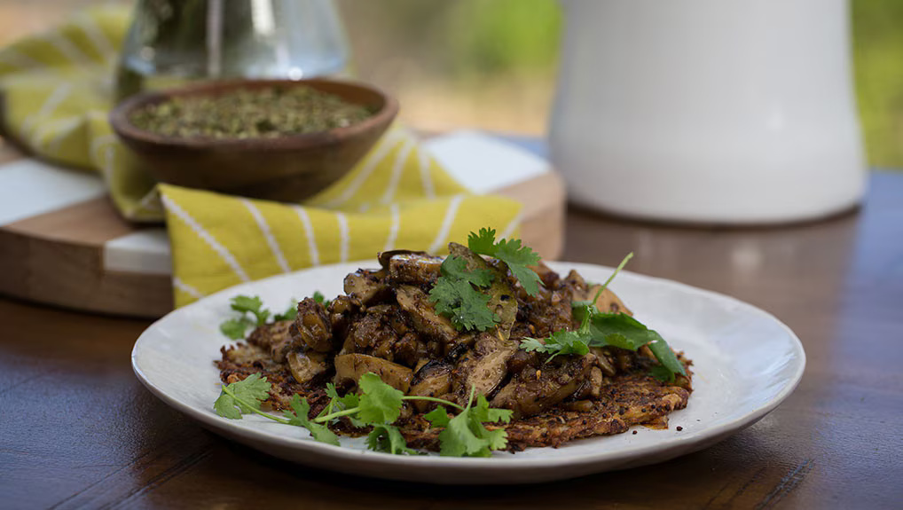 - To assemble, place a decent amount of the Abalone mixture onto the rosti, season if you prefer and garnish with fresh coriander.