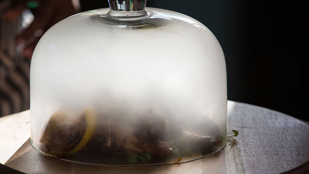 4. To serve, place onto a board with some microherbs, in a small bowl add rooibos leaves and ignite to create smoke, cover the dish with a clear cloche and present to guest. Open up the cloche to release the rooibos smoked wings & enjoy.