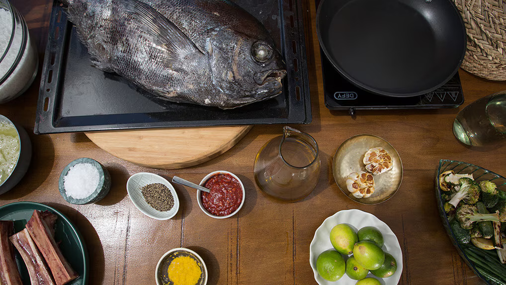 - Preheat the oven to 180°C. To prepare the fish, line a baking sheet with baking paper. In a bowl, mix together the salt and water until it forms a wet sand like texture. Place the lemon slices inside the fish. Rub the skin of the fish with the olive oil.