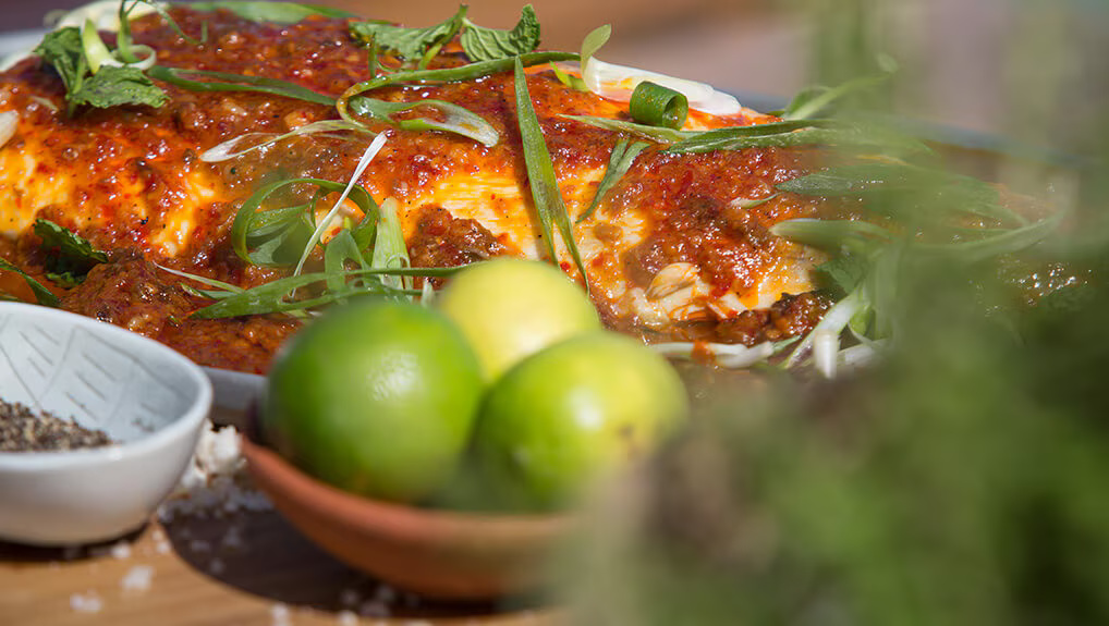 - Add this butter to a pan allow to heat up and pour over the fish after you’ve removed it from its casing. Garnish with fresh spring onion and micro herbs.