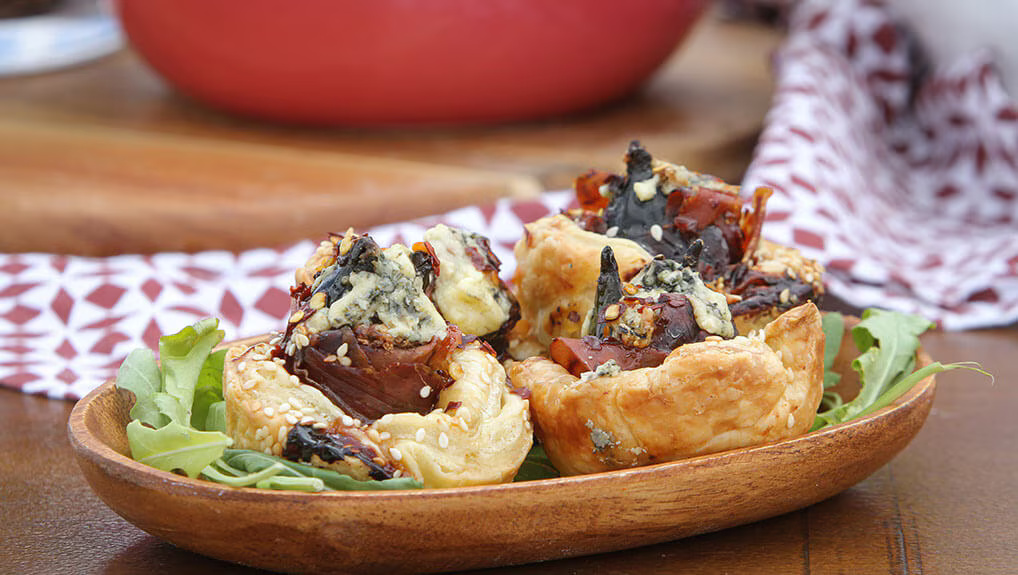 In a pan, crisp up the prosciutto before wrapping into the puff pastry circles. Place into a muffin tray brush with milk, sprinkle sesame seeds and bake for 15 minutes until golden.