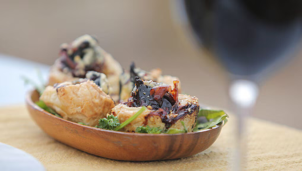 Place the baked pastry pockets onto the micro herbs & dress with the sauce.